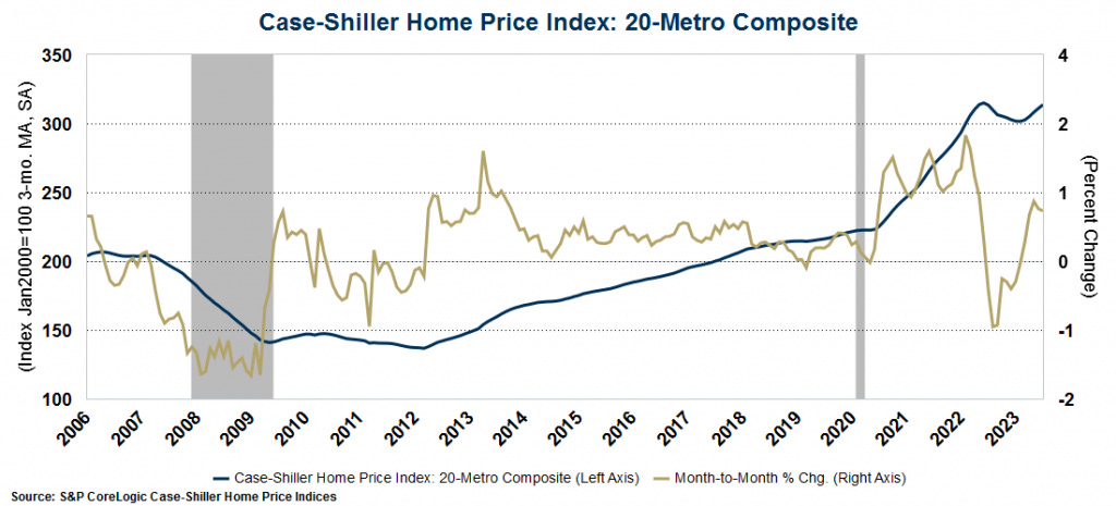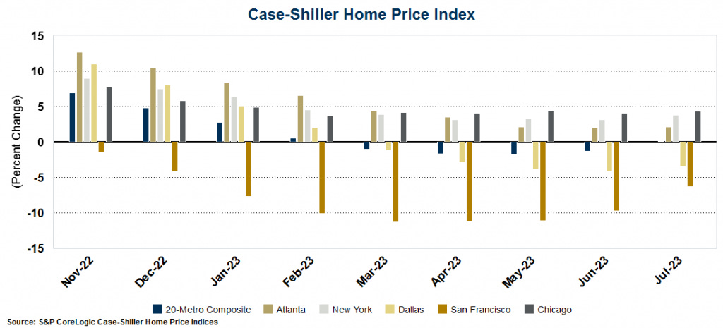The week started with data from Case-Shiller on home prices in 20 major metro areas. According to the data, home prices rose for the 5th consecutive month jumping nearly 1% in July and posting year-over-year growth for the first time since February.
