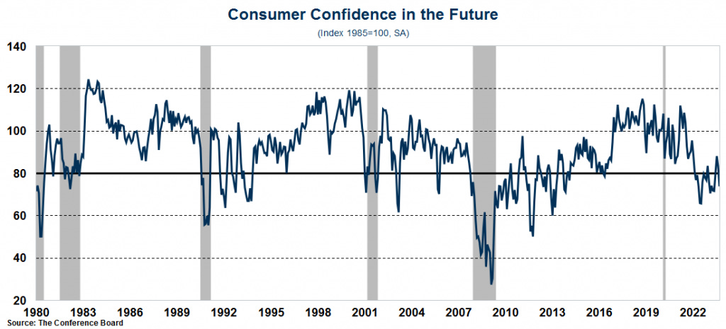 The index that looks at how consumers feel about the economy right now was virtually flat in September. But the index that asks them how they feel about the economy 6 months from now dropped nearly 10 points. That drop puts the consumer expectations index well below 80. Why is that important? Because a reading below 80 tends to signal a recession. As you can see below, the index has spent quite a lot of time below 80 since the spring of last year.