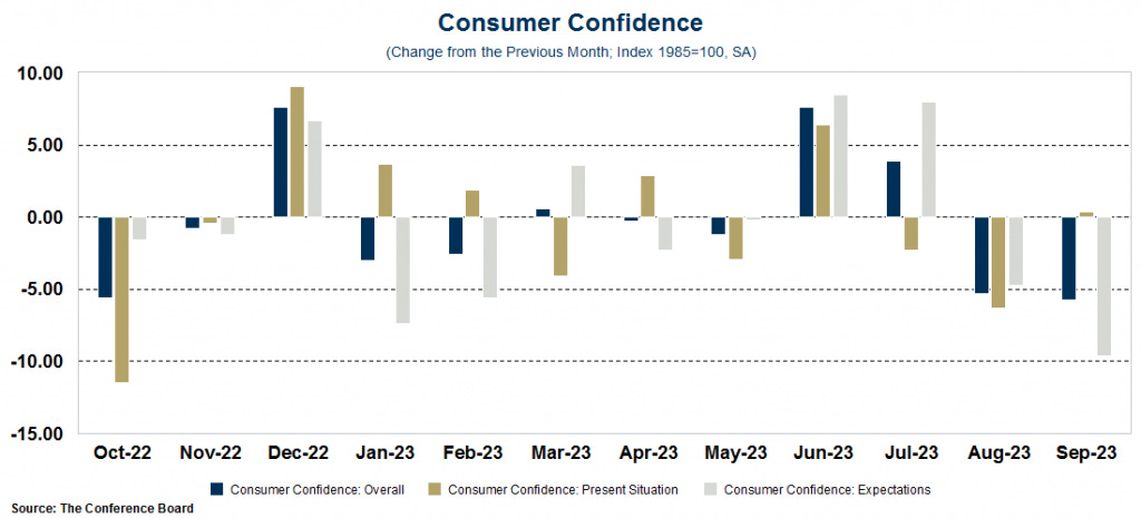 High mortgage rates, rising prices, expensive gas, striking auto workers, a weak stock market, and a looming government shutdown are all taking a toll on consumers. The Consumer Confidence Index dropped 5.7 points in September, nearly twice the drop economists were expecting. This index is a closely watched measure because it tends to be a good gauge as to whether the economy is getting better or worse. While their overall confidence is higher, those with incomes over $125,000 reported the largest drop in confidence in September.