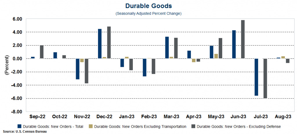 If consumers are feeling less confident, they probably aren't going to be spending a lot of money on durable goods. So, it was a slight surprise on Wednesday when the Census Bureau reported that durable goods orders actually grew 0.2% in August. Economists had been expecting a decline of 0.5%. However, as usual, you need to dig a little deeper into the data and not always stop at the "headline number." If you look further, at the data, you discover that if you exclude defense spending on durable goods, new orders actually declined 0.7%...the second monthly decline in a row. Again, not surprising as high interest rates and the fear of an impending recession naturally reduce consumer demand for big-ticket items. Further, higher financing costs also discourage businesses from spending and investing.
