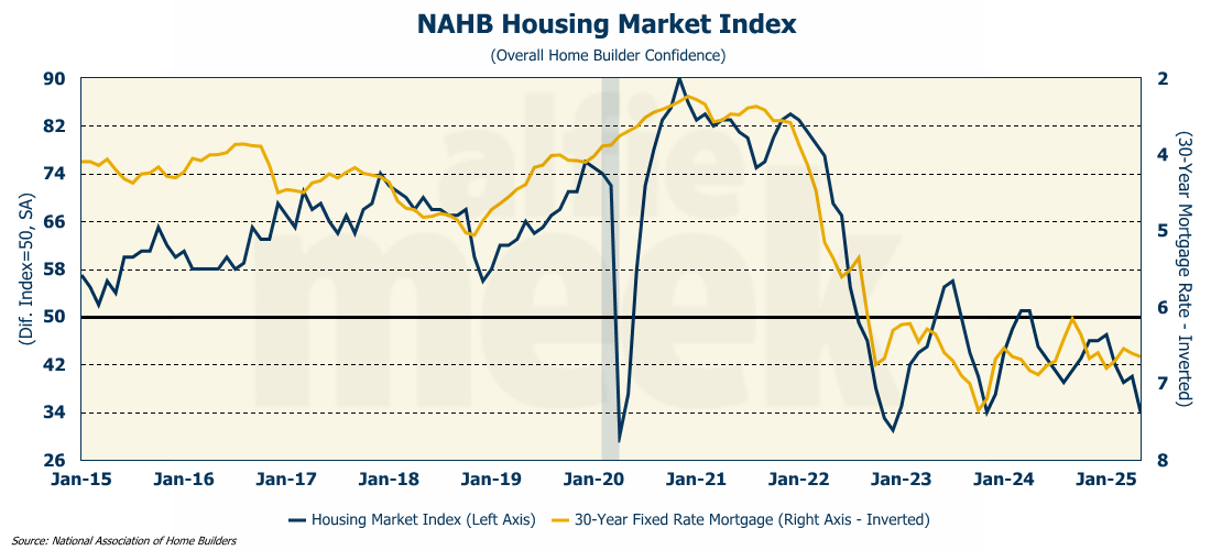 It would appear that home builders may need to start taking Prozac. Home builder confidence fell 6 points to 34 in May (well below expectations). That is the lowest level since January 2023, and close to the COVID low of April 2020 (full release here).