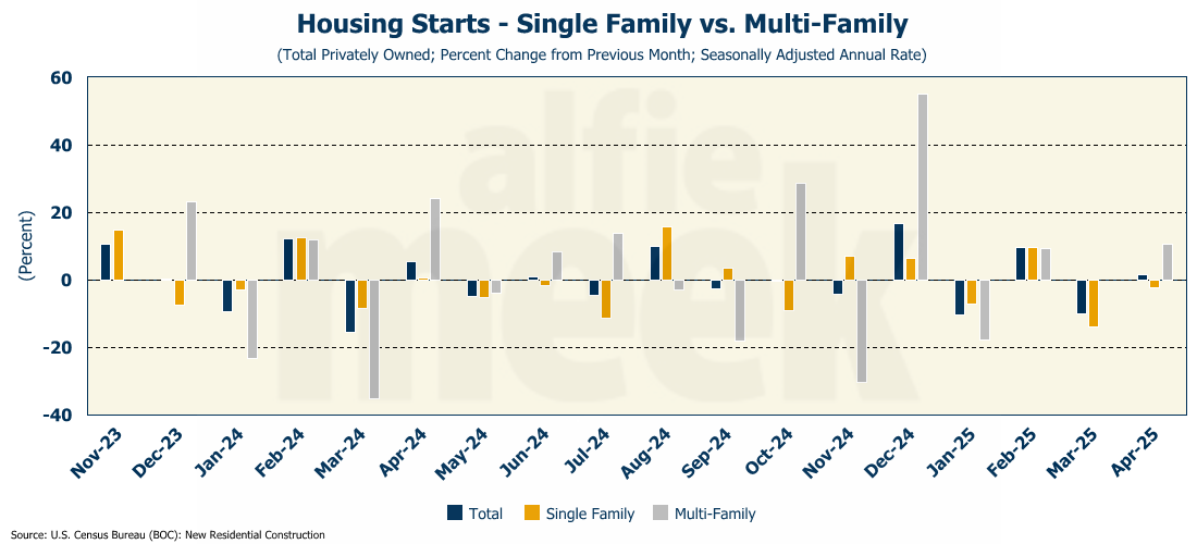 Multi-family starts, however, were up 10.7% in April, as renting continues to be a more financially attractive option for many, especially those who would otherwise be first-time home buyers. Apartment rents have been fairly steady since mid-2022, while the average monthly cost to buy is now 65% higher than the cost to rent. In December 2021, they were equal.