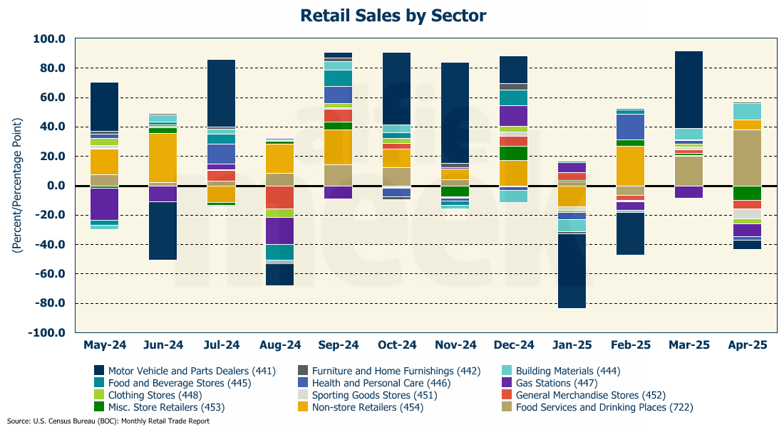 And because elasticity is a thing, retail sales were a bit weak in April, rising only 0.1% (full release here). If consumers didn’t need it, they didn’t buy it. Although, to be fair, this was mostly because of the front-loading consumers did in March to get ahead of any potential price increases (see graph below). However, despite the tariffs and the surrounding economic uncertainty, consumers still spent enough to keep the economy growing.