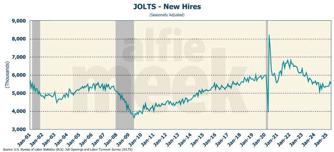 While the number of job openings is welcome news, the number of actual new hires did fall by 112K. Even so, the number of new hires has clearly been on an upward trend since June of last year.
