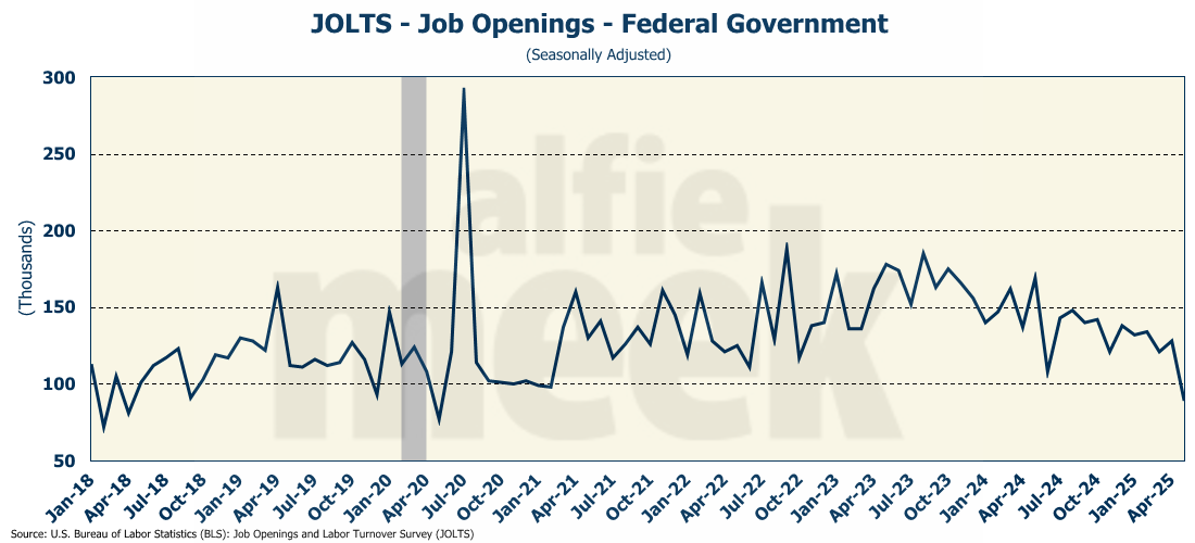 Not surprisingly, job openings with the Federal Government have plunged by 39K. Excluding COVID, you would have to go back to 2018 to find a month with a level of Federal job openings lower than those posted in May. I fully expect that number to continue to decline.