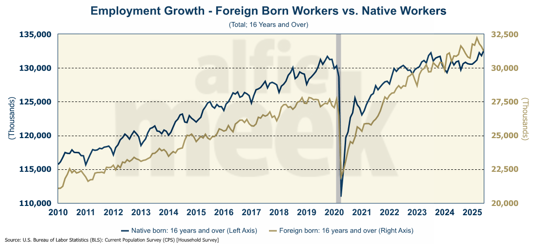 Lastly, the number of native-born workers jumped 830K to an all-time record level of 132.7 million. At the same time, foreign-born workers dropped 348K to only 31.2 million, the lowest level so far this year.