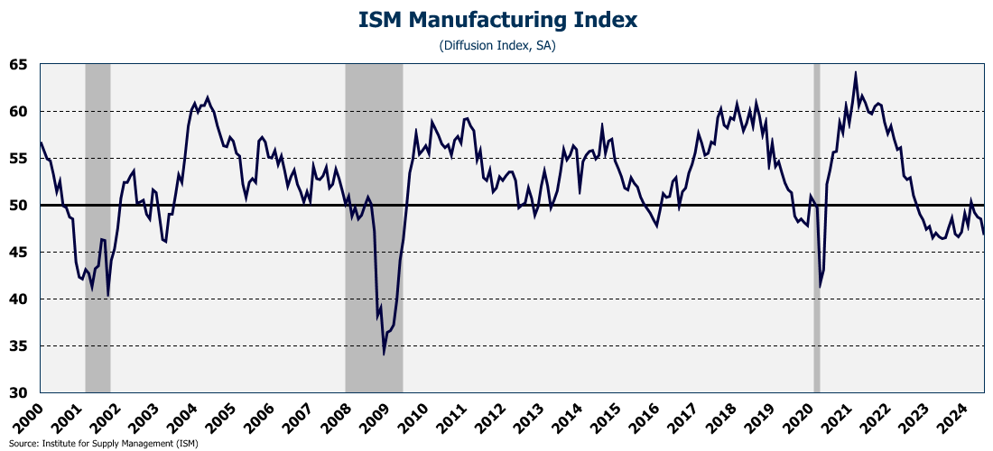 The decline in the manufacturing sector continues as the ISM manufacturing index plunged to 46.8 (full release here). That was much weaker than the 48.8 that was expected, and is the lowest the index has been since last November. Remember, this is a “diffusion index” which means that any reading below 50 indicates the sector is contracting. With the exception of one month, the index has been below 50 since late 2022. In June of 2023 the index got as low as 46.4, which, with the exception of the COVID shut downs, is the lowest it had been since the Great Recession. We are very close to re-visiting those lows.