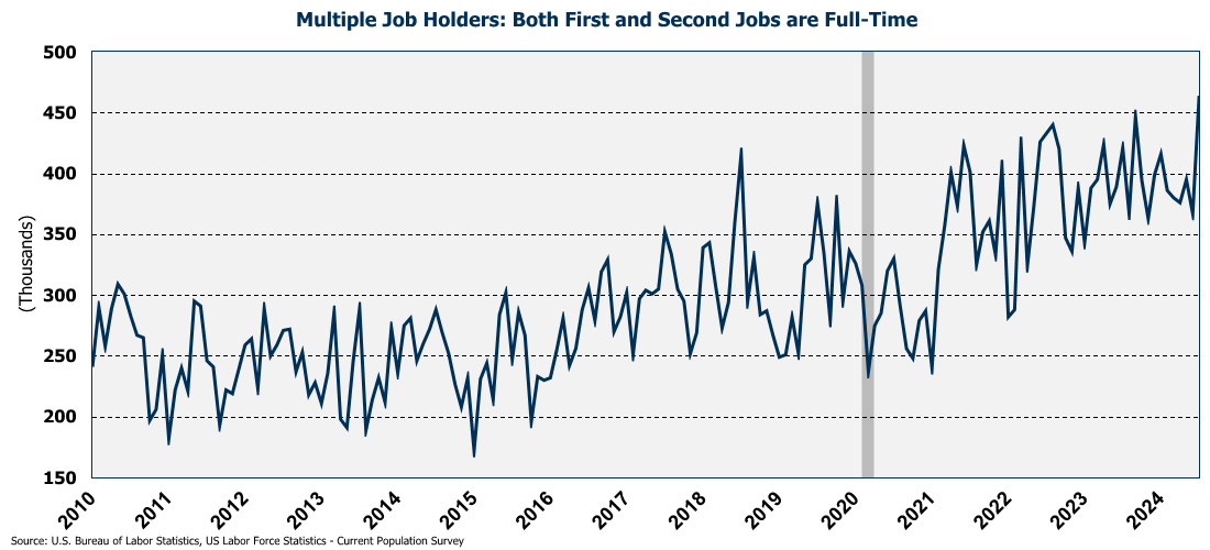 The larger problem, however, continues to be that people need multiple jobs to make ends meet, and showing up on multiple payrolls inflates the establishment survey which then makes the economy look better than it is. Digging into the data, we see that the number of people with TWO FULL TIME JOBS rose to an all-time high of 464K!