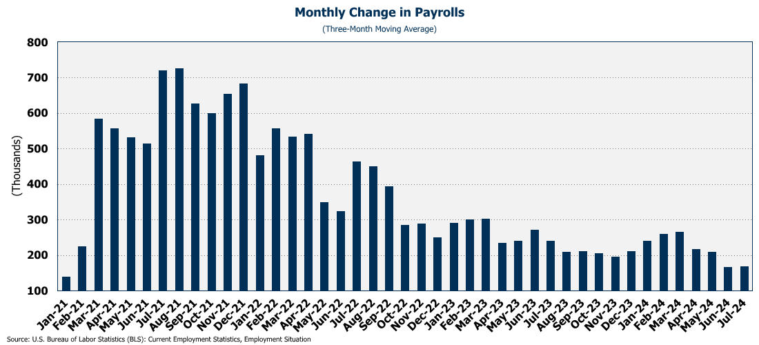 Speaking of the country’s economic outlook, this morning we got the employment numbers for July. And they were no good. Economists were expecting 175K new jobs and for the unemployment rate to remain steady at 4.1% However, the number came in at only 114K and the unemployment rate exploded to 4.3%. That may not seem like a big jump, but for the unemployment rate, 0.2 points is a HUGE move. And, in a surprise to no one, the June number was revised DOWN from the initial report of 206K jobs to 179K jobs…a 13% drop. As I have said before, this is why I used a 3-month moving average and you can see from the chart below that employment growth is clearly decelerating.