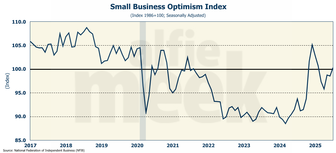 When the President was elected last November, small business optimism rose sharply, as it often does when a Republican wins the White House. However, it soon fell back as the news of tariffs sent a wave of terror through the small business community. However, as it has become increasingly clear that the predicted tariff-induced economic doom was little more than the false cry of “wolf,” small business optimism has been moving up, and rose back above 100 in July (full release here). It is now above the 52-year average of 98.