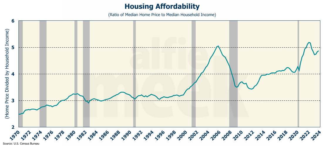 No, the main problem is quite simple…wages haven’t kept up with inflation, and they certainly haven’t kept up with housing inflation. In 1970, the median home price was 2.5 times the median household income. By 1980, it was 3.2 times, and it stayed roughly at that level for 20 years. But in 2000, it started to rise, and during the housing bubble it peaked at 5 times household income. Ater the bubble burst, it fell back to the 3.5 range, but then it started rising. By 2018, the median home was 4.2 times the median household income. But after COVID, it rose sharply and is now in the 5x range where it was during the housing bubble in 2005.
