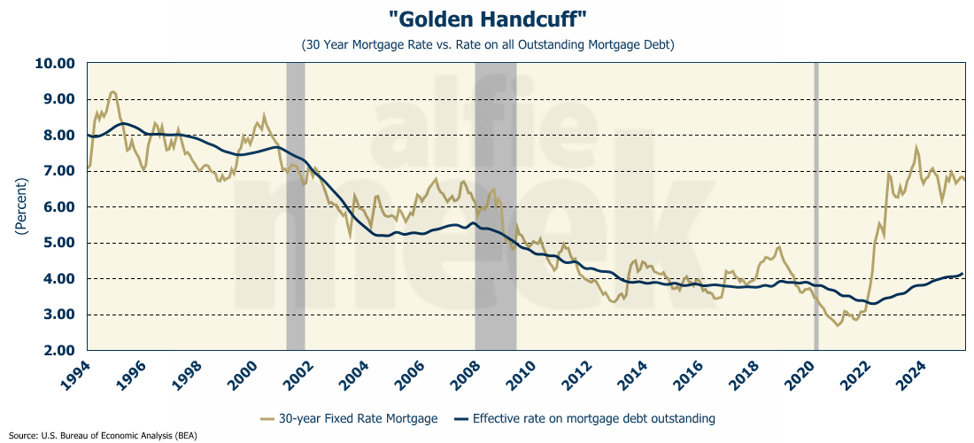The effective rate on all outstanding mortgages is now 4.15% which is more than 260 basis points below the current 30-year mortgage rate. To be more specific, 87% of mortgage holders have rates below current rates, and two-thirds have a mortgage rate that is more than 200 basis points below current rates. Until that gap closes, existing homeowners are unlikely to release their existing mortgage and free up inventory.
