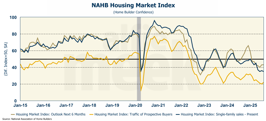 The index has been below 50 for 16 consecutive months. A reading below 50 is an indication that the majority of builders do not feel confident about the current and near-term outlook for housing.