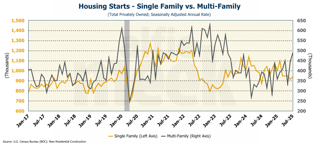 The number of multi-family starts is at the highest since May 2023 coming in at an annual rate of 489K units. Single-family starts, while up in July, are only running at an annual rate of 939K units, less than pre-COVID.