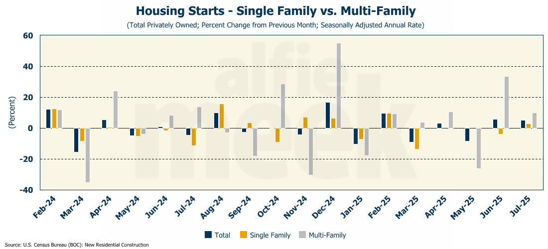 While permits were down, the data for housing starts was mixed. Overall, housing starts were up 5.2% with single-family starts up 2.8% and multi-family starts up 9.9%.