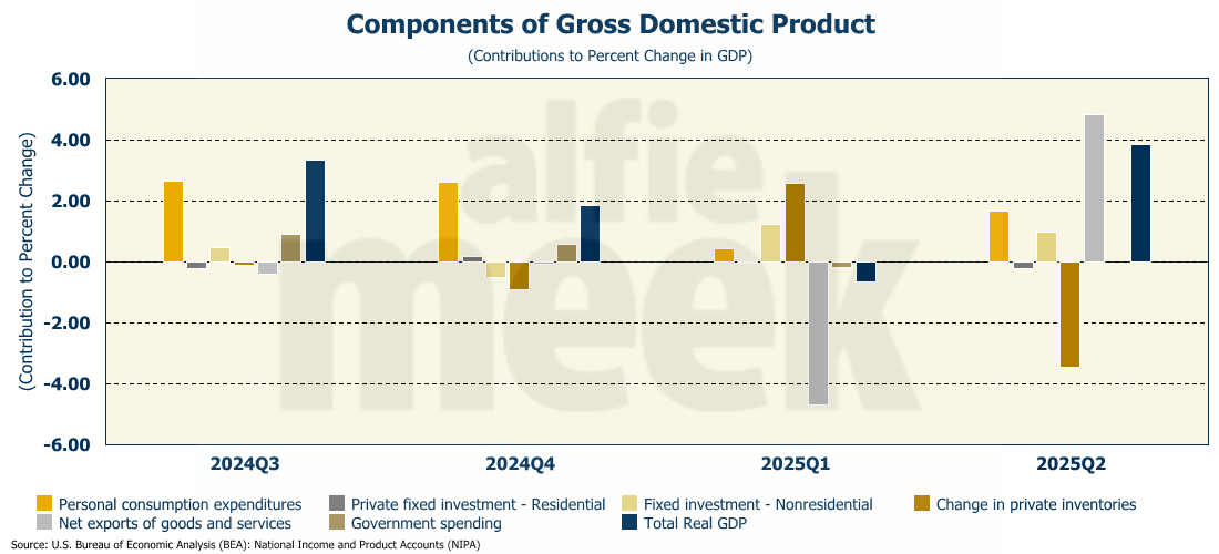 Second, there were net exports, which are usually a negative contributor to GDP, as the U.S. typically imports far more than it exports. Remarkably, it turns out that if you impose tariffs on foreign goods, you will import less. Who knew? Plus, we imported a ton in the first quarter to avoid tariffs, so that is also having an impact on the second quarter reading.