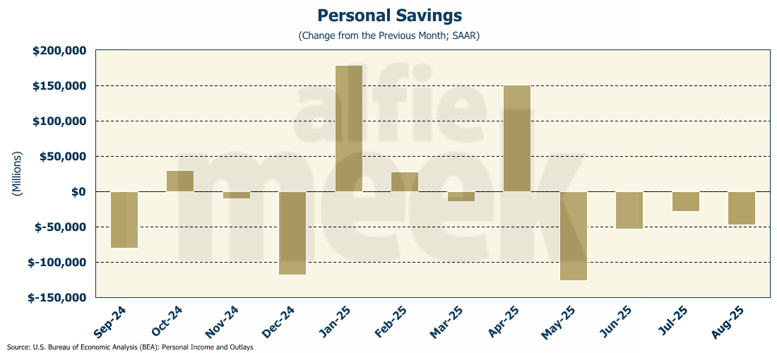 Once again, spending grew faster than income. As such, for the fourth consecutive month, personal savings declined, falling nearly $47 billion in August, and bringing the savings rate down to 4.6%.