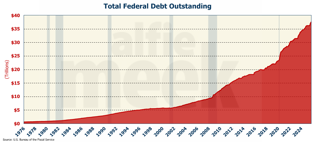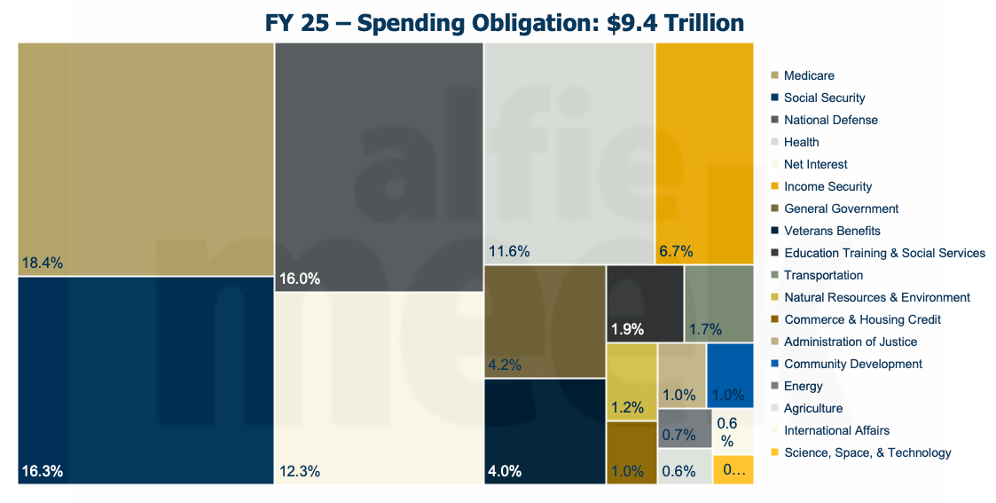 But perhaps that’s not a bad thing. As long as the government is “shut down,” it isn’t spending money…or at least as much money. In FY 25, the obligations of the Federal government were $9.4 trillion, $6.6 trillion of which were new expenses. $1.7 trillion for Medicare. $1.5 trillion for Social Security. Another $1.5 trillion for defense. $1.2 trillion for health care. $1.2 trillion in interest. And on and on it goes.