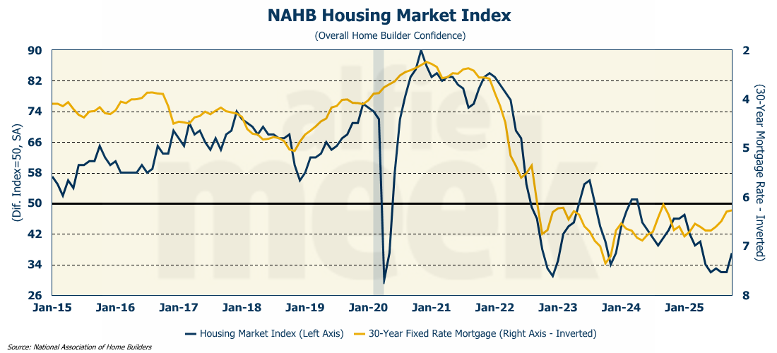 In a bit of a surprise move, home builder confidence, which had been flirting with COVID-era lows, jumped 5 points in October to the highest level since April (full release here). The index typically moves in tandem with the inverse of the mortgage rate, but in recent months, it has not responded to the drop in the 30-year rate toward 6%.