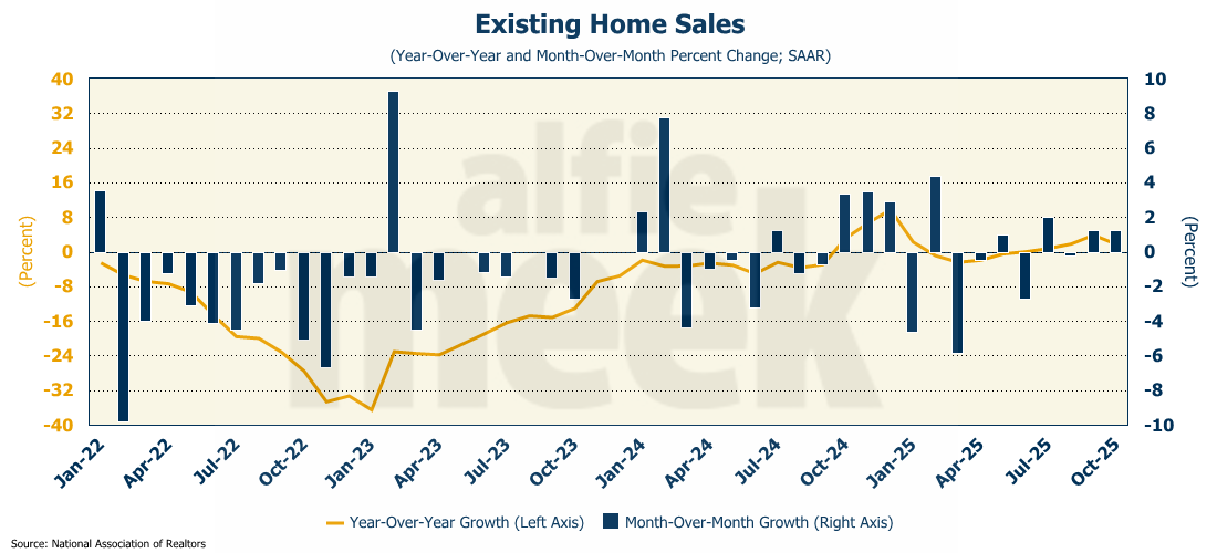 The National Association of Realtors released data on existing home sales for October, and they performed exactly as expected, rising 1.2% for the month and 1.7% over last year (full release here).