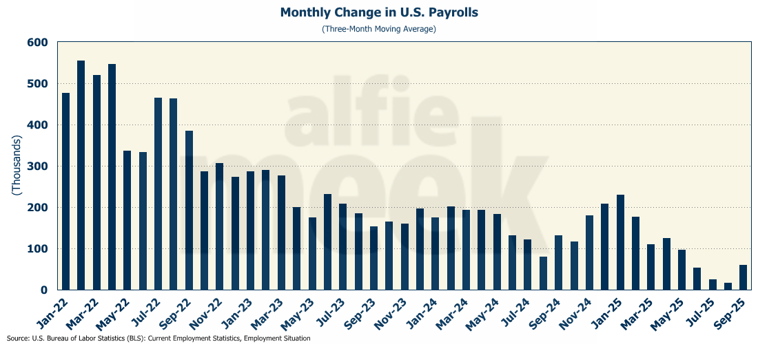 And in a surprise to absolutely no one, the August number was revised down to NEGATIVE 4K. That means that in two of the last four months (June and August), the U.S. economy actually lost jobs. Longtime readers know that these consistently negative revisions are why I prefer to view the establishment employment data on a three-month moving average basis. However, even on a three-month moving average, the September reading (as it currently stands) was large enough to buck the downward trend that has been in place since April.