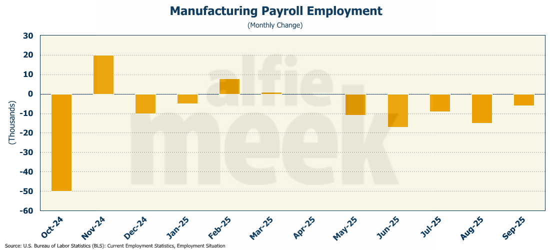 Despite the overall employment growth, manufacturing lost 6K jobs in September, the fifth consecutive monthly decline, and the seventh monthly decline in the past year.
