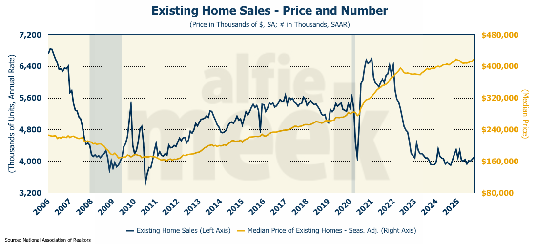 The increase lifted the annual rate to 4.1 million units, the highest level in eight months. Even so, 2025 is shaping up to be even worse than 2024, which was itself the worst year for existing home sales since 1995. Despite the sluggish sales, the median price hit an all-time record, rising to $418,668 on a seasonally adjusted basis, which is 2.8% higher than one year ago.