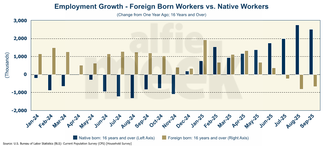 Not surprisingly, since the November election, the change in employment among native-born vs. foreign-born employees has changed dramatically. For the 12 moths prior to the election, native-born employment was down 1.1 million, which foreign-born employment was up more than 400K. However, over the past 12 months, those numbers have switched dramatically, and native-born employment is up 2.5 million while foreign-born employment has fallen 670K.