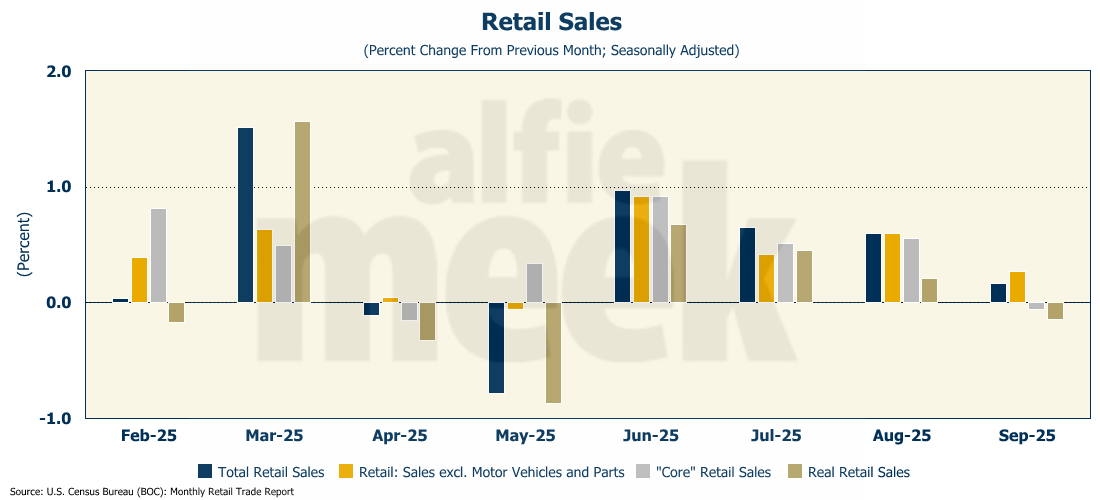 The folks at the Census Bureau are slowly getting back to work after their 43-day vacation, and data is starting to trickle out. On Tuesday, they released the long-delayed retail sales numbers for September (full release here), and the numbers are consistent with the sentiment and confidence numbers above. According to the government, retail sales in September grew only 0.2%. That was slower than expected and the slowest rate since May. But that was nominal growth. Adjusted for inflation, retail sales actually fell 0.1%, again, the worst showing since May.