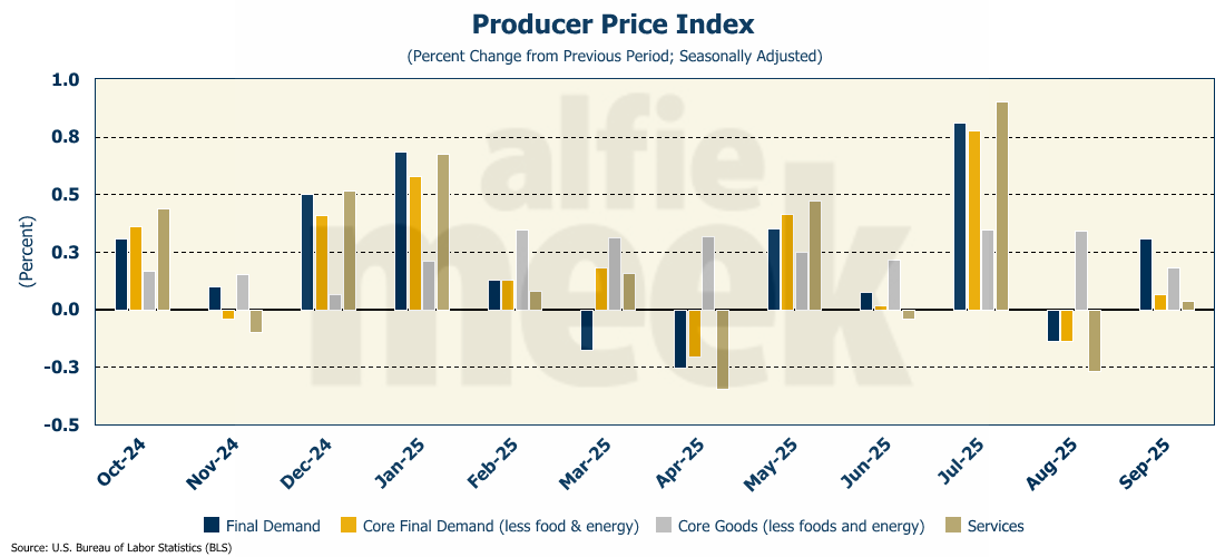 In addition to the employees at the Census Bureau, the employees at the Bureau of Labor Statistics (BLS) are also getting back into the swing of things and were able to publish the Producer Price Index for September (full release here). For the month, producer prices were up 0.3%, which kept the year-over-year number steady at 2.7%. However, in a reversal from August, core final demand and services costs at the wholesale level rose in September, albeit only slightly.