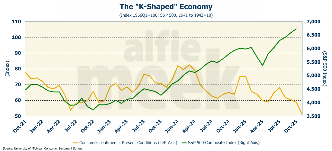 This is probably not the best news to get on “Black Friday” and it certainly doesn’t bode well for the Christmas season. We often hear the term “K-shaped” economy. What does that actually mean? In technical terms, it means that some parts of the economy are performing well, while others struggle or decline, creating a divide. This is visualized as a “K” graph, with one line trending upward and the other trending downward. Let me give you an example. As mentioned above, the consumer sentiment in the present economy hit a 41-year low. That is because the bulk of the population is feeling economic pressure. However, those few at the top of the income ladder, who are likely heavily invested in equity markets, are feeling great as the overall market has recently soared (last week not withstanding).