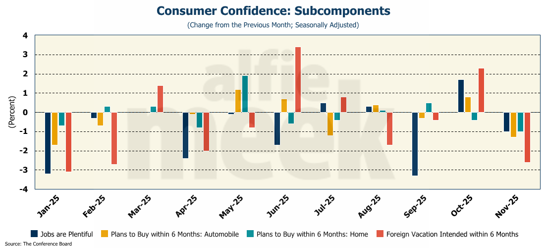 That becomes even clearer when you look at the subcomponents of the index. The share of people who plan to buy an automobile, buy a home, or take a foreign vacation in the next six months all fell sharply in November. In addition, in a reversal from October, the share of respondents who said “jobs are plentiful” also fell.