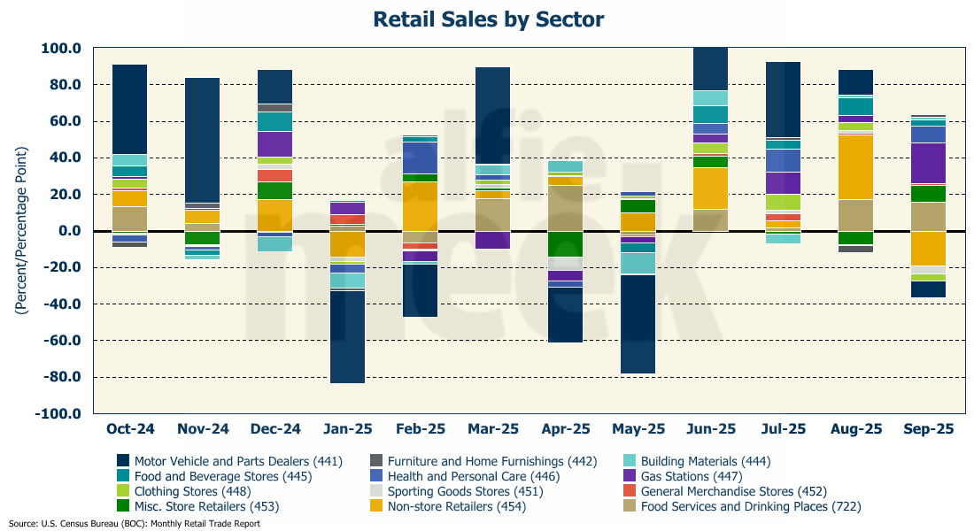 Looking at the detail by sector, “non-store retailers” (aka, online retailers) saw the largest drop, followed by motor vehicle and parts dealers, clothing stores, and sporting goods stores.