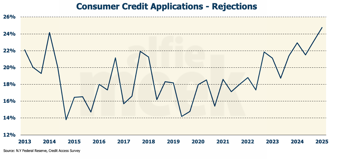 Of more concern is the fact that “buy now, pay later” accounted for almost $800 million of the Black Friday sales. As I have been saying, consumers appear to be tapped. Recent data from the New York Federal Reserve Bank shows that consumer credit applications are now being rejected at almost 25% - the highest rejection rate ever recorded.