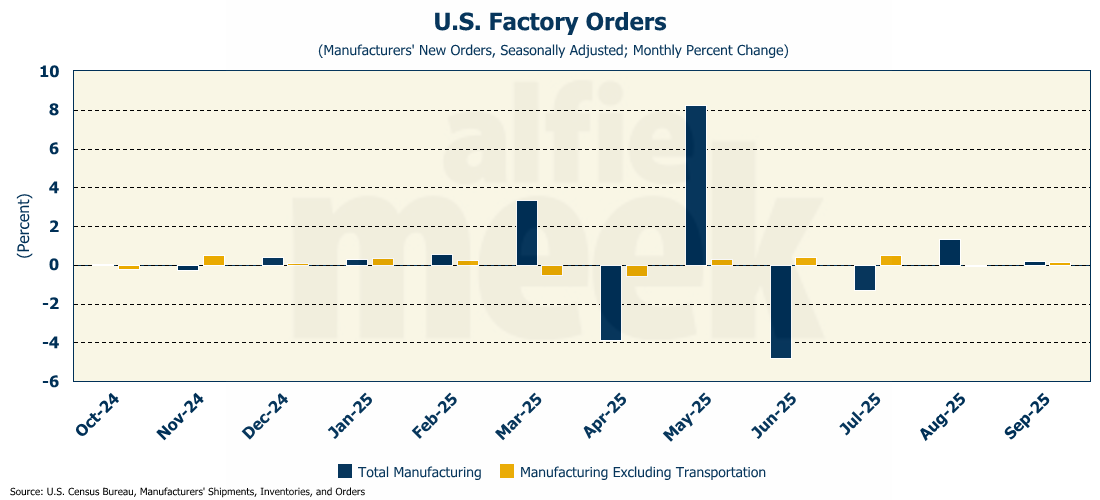 As with industrial production, the Census Bureau also released the delayed September reading for factory orders (full release here). With industrial production weak, it isn’t surprising that factory orders also disappointed, rising only 0.2% in September. Manufacturing, less the volatile transportation sector, also rose 0.2% for the month.