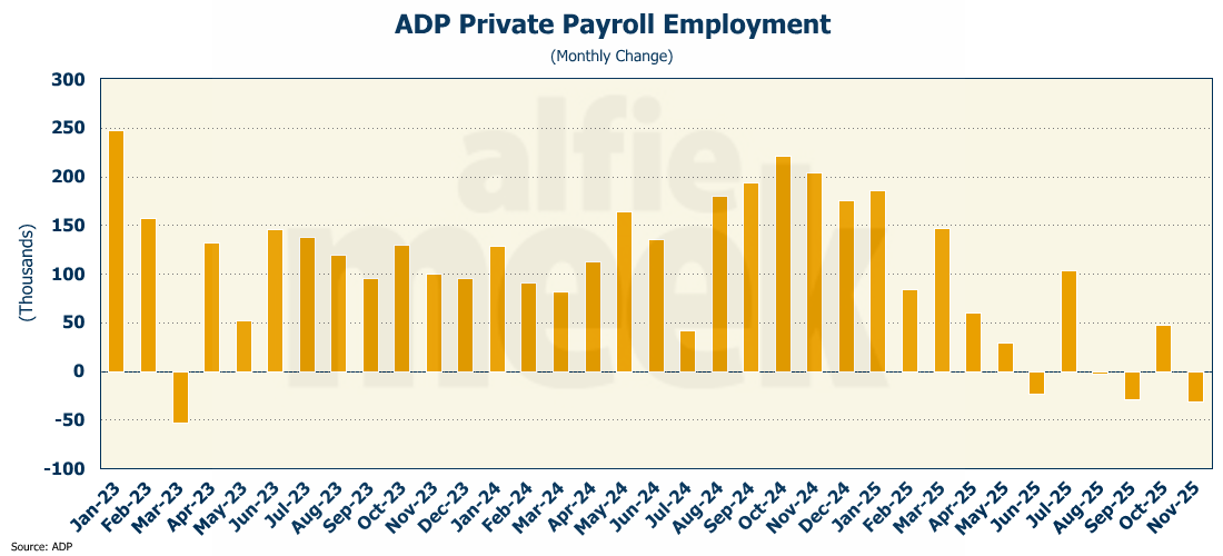 Since employment data is still hard to come by, I will continue to rely on the ADP employment reports, and for November, the news wasn’t good. According to ADP, private sector payrolls fell by 32K last month, the largest monthly decline since March 2023 (full release here). According to ADP, four of the last six months have posted a decline in private sector employment.