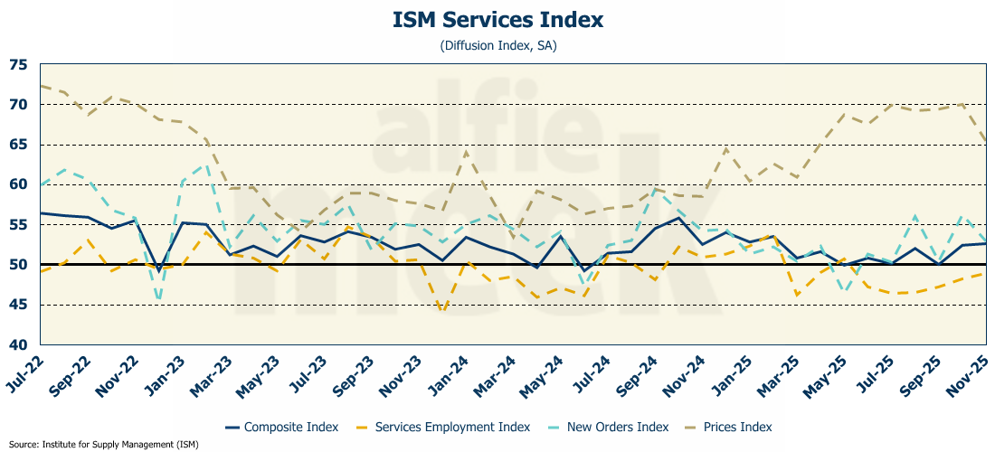 Once again, manufacturing may be down, but the service sector, as measured by the ISM Services index, continues to expand (full release here). The index rose from 52.4 to 52.6, much better than the 52.0 that was expected. Services employment, while still in “contraction” territory, moved closer to 50, rising 0.7 points to 48.9. Also, service industries reported seeing slower growth in prices. In total, the service sector seems to have put the “tariff” scare behind it and is well-positioned heading into 2026. The only question is the strength of the consumer.