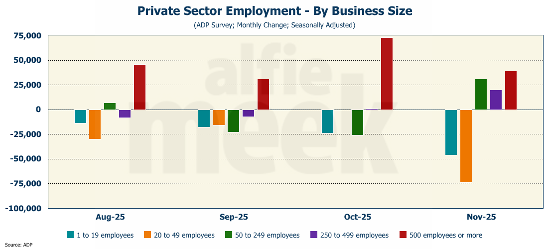 Interestingly, the decline was driven entirely by job losses in small businesses, with businesses less than 50 employees dropping 120K employees.