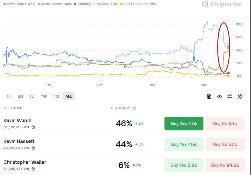 While they are no doubt correct, one has to wonder why it has suddenly occurred to these titans of Wall Street that Mr. Hassett would be the President’s puppet? Kevin Hassett has been the frontrunner for months and has made no secret of the fact that he believes rates should be considerably lower. But, whatever the reason, as of last weekend, Mr. Hassett has lost his “front-runner” status to another Kevin…..Kevin Warsh, who is now a slight favorite according to Polymarket.