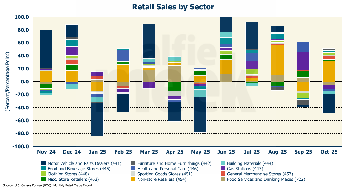 However, “core” retail sales (retail sales excluding food service, autos, gas, and building materials) posted a strong growth of 0.9% during the month, suggesting that consumers were out early shopping for deals for the upcoming Christmas season. And you can see from the chart below that most of that was done online (“non-store retailers”).