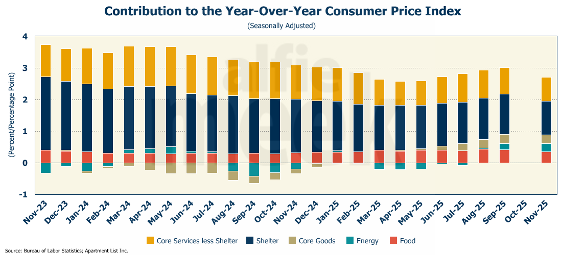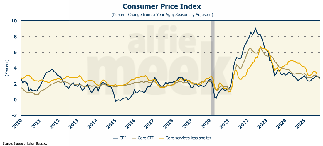 On a month-over-month basis (well, sort of…November over September), the index rose 0.2% and was up 2.7% from November 2024. That was an unexpected sharp drop from the annual rate of 3.0% in September.