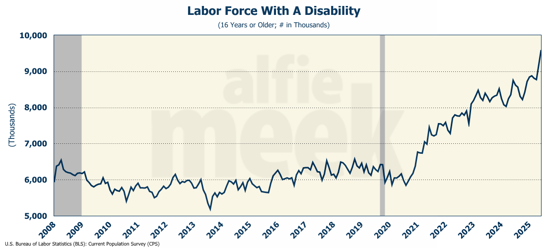 Finally, another interesting trend is the rapidly rising number of people in the labor force with a disability. In November, that number rose to an all-time high of 9.6 million, which is more than 40% higher than the number pre-COVID.
