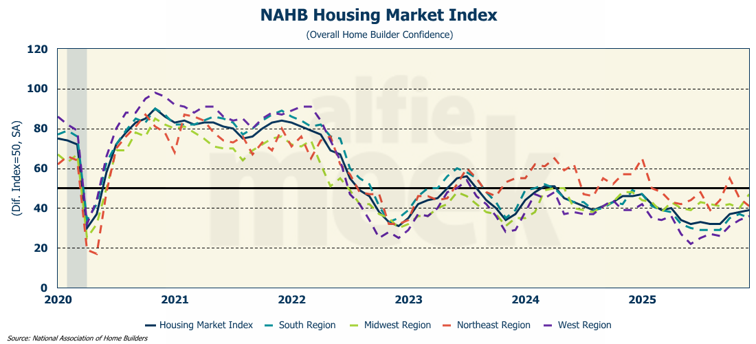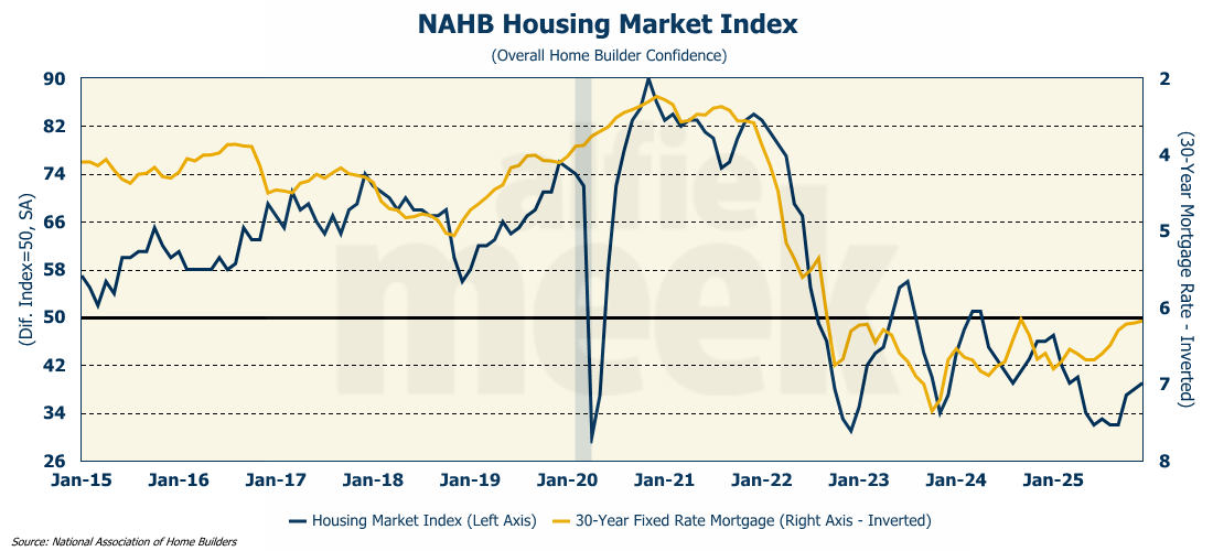 On a regional basis, the Midwestern part of the country performed the best, with builder confidence rising 7 points to 47. However, that is still below 50, which means that even in the Midwest, there are more builders saying the housing market is “poor” versus “good.” The overall index hasn’t been above 50 since April of 2024, and until mortgage rates come down significantly, it isn’t likely to move above 50 anytime soon.