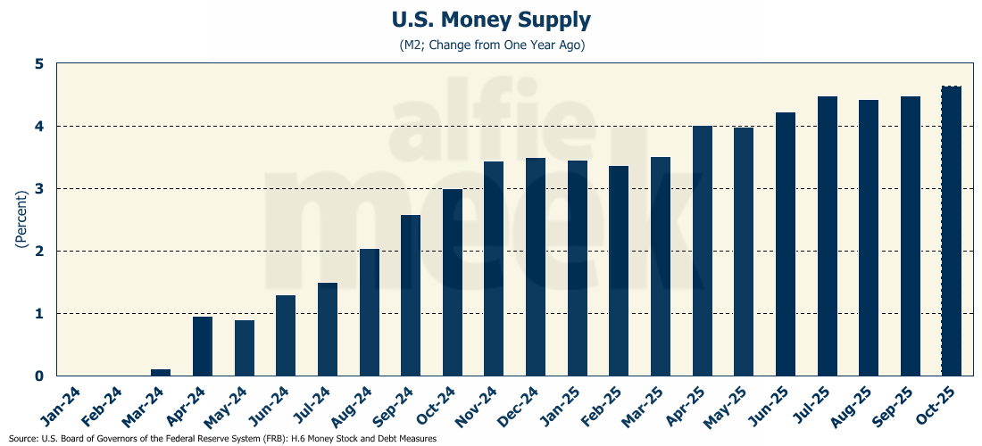 Despite the expansion of the money supply and the cutting of interest rates, the CPI has been falling since August. While interest rate cuts can take 12-18 months to work through the economy, this decline is still surprising given that the money supply has been growing more than 4% since the spring.
