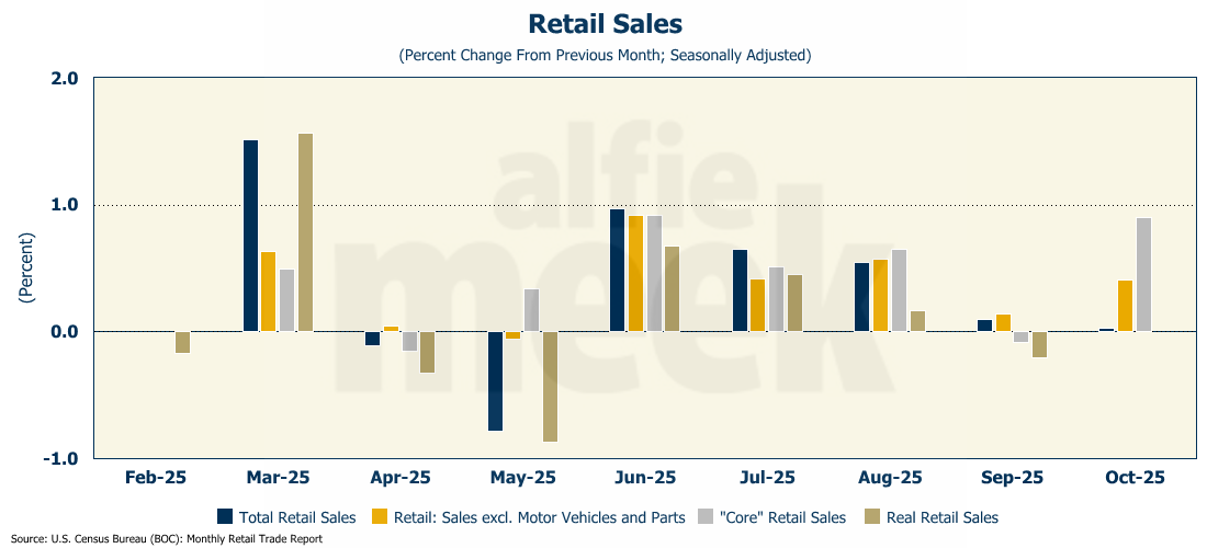 Retail sales data is still lagging, and this week brought us the numbers for October (full release here). The numbers were significantly lower than anticipated, with October retail sales coming in virtually the same as September. That pulled the annual number down to 3.5% - the lowest since May.