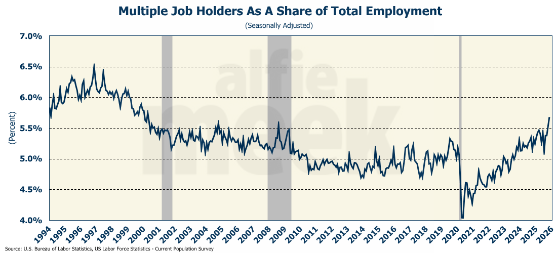 Also, the number of people with multiple jobs rose by almost 500K to 9.3 million, which is the highest level ever recorded. That number represents 5.7% of the total number of people employed. Multiple job holders hasn’t that high of a share of total employment since April of 2000.