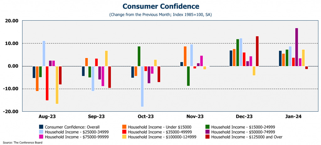 Interestingly, the only income group that posted a decline in consumer confidence are those making $125K or more. The $50K-$75K middle-income group posted the highest increase in confidence after several months of being relatively pessimistic about the economy.
