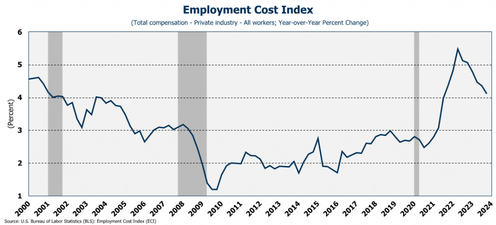 In the fourth quarter of 2023, private sector employment costs were 4.1% higher than Q4 2022. While that was a decrease from the 4.4% in the third quarter, year-over-year employment costs are still growing at a rate not seen since early 2001. Given that labor is a significant input into many goods and nearly all services, recently won wage concessions by the UAW, airline stewards, health care providers, etc. will keep employment costs - and by extension services inflation - elevated. (I would have also included UPS drivers in the list of recently won wage concessions, but the announcement this week of 12,000 layoffs at UPS puts distinctively downward pressure on their employment costs....be careful what you wish for.)
