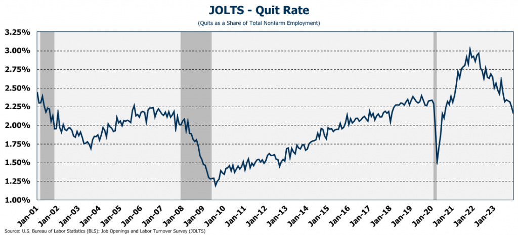Another indication of the softening labor market is the quit rate, which fell to 2.2% in December with only 3.4 million people walking away from their employer. That is the lowest level in several years - going back before COVID - and far below the post-COVID peak when 4.5 million people quit their job.