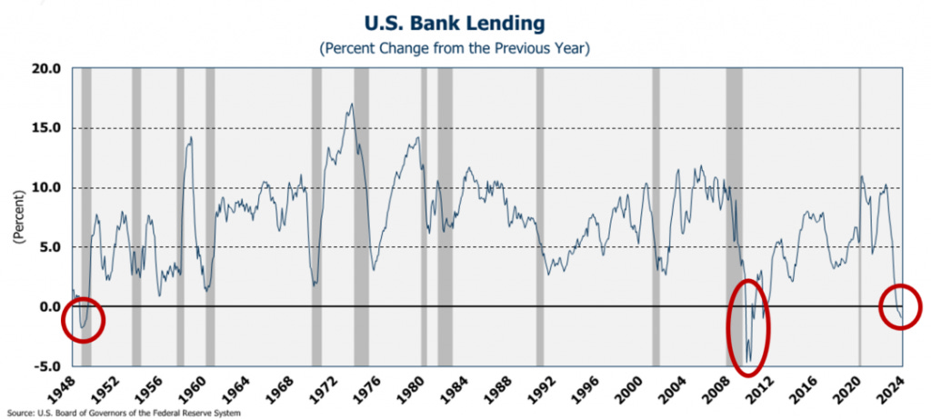 In addition, they also removed the phrase, "the U.S. banking system is sound and resilient." Now THAT should cause some alarm! A quick look at bank lending suggests something is certainly amiss. Currently, bank lending is NEGATIVE on a year over year basis. This has only happened two other times in the last 75 years! Once after the 2008 financial collapse and then back in 1949.